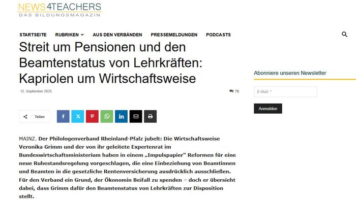 Wie news4teachers berichtet, gab es bei der aktuellen Diskussion rund um die Verbeamtung von Lehrkräften und deren Ruhestandsbezügen wieder einmal Verwirrung. Mancher auf der Seite der Beamtinnen und Beamten freute sich schon: Der von der „Wirtschaftsweisen“ Veronika Grimm geleitete Expertenrat im Bundeswirtschaftsministerium hat sich in einem aktuellen „Impulspapier“ gegen die Forderung nach einer Einbeziehung von Beamtinnen und Beamten in die gesetzliche Rentenversicherung ausgesprochen.