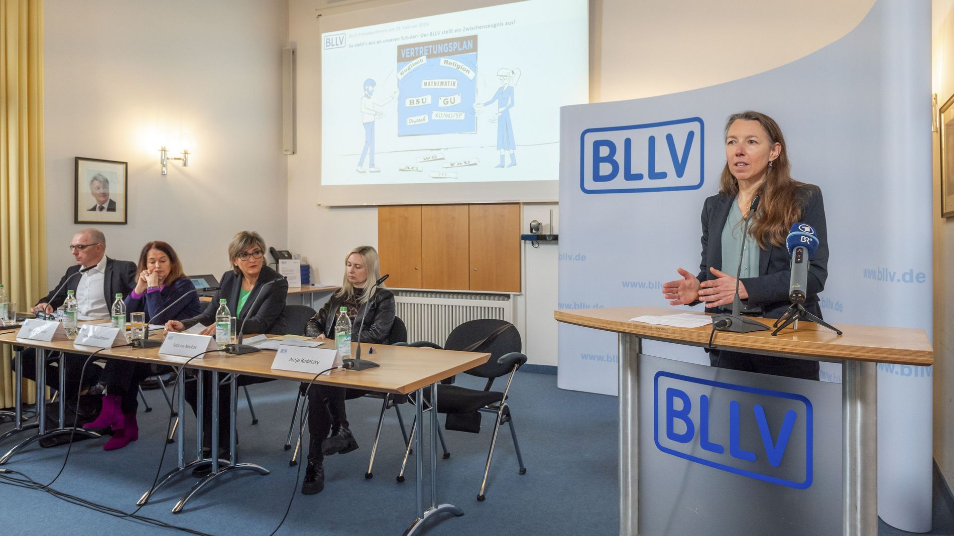 Auf dem Podium der Pressekonferenz sitzen neben der BLLV-Präsidentin drei Kolleginnen, alle Schulleitungen an bayerischen Schulen, die ihren Schulalltag und die schwierige Aufgabe beleuchten, vor der sie inmitten des Lehrkräftemangels stehen: Frau Antje Radetzky, Schulleiterin an einer Grundschule und Leiterin der Abteilung Berufswissenschaft im BLLV. Frau Sabrina Neckov, Schulleiterin an einer Grundschule und Frau Beate Buchholz, Schulleiterin an einem sonderpädagogischen Förderzentrum.