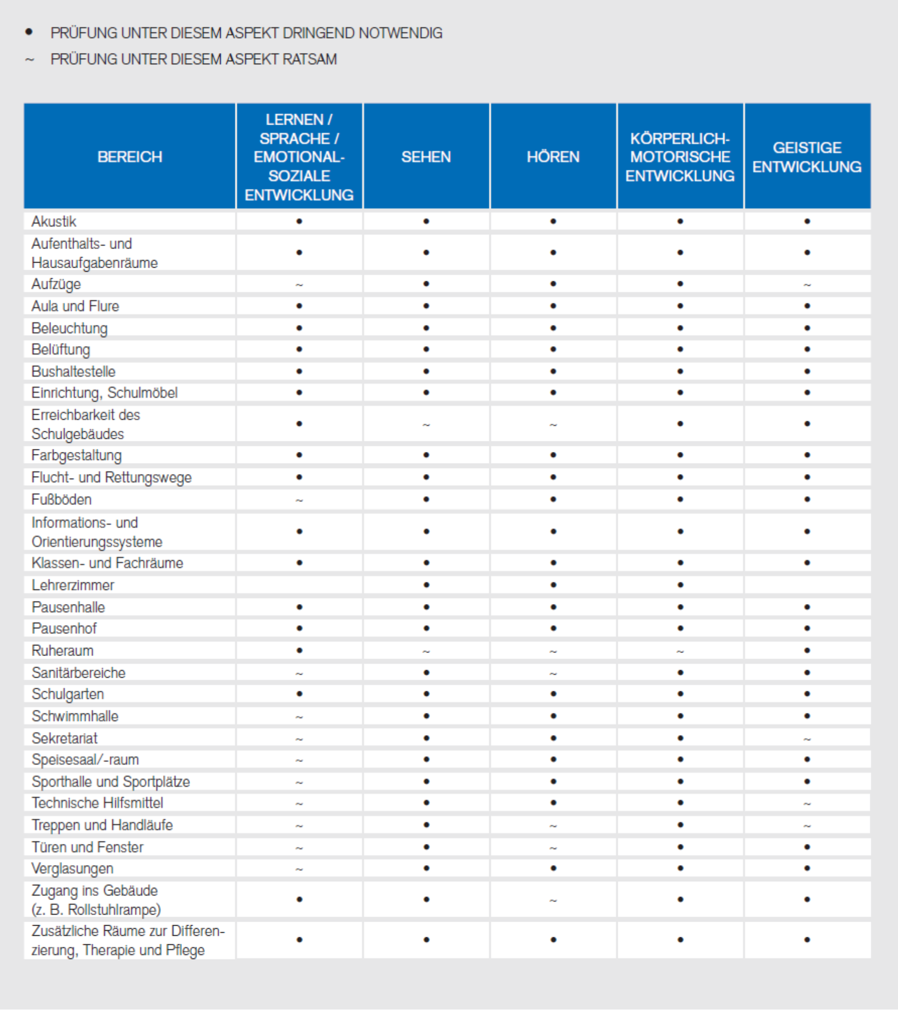 Bei Schulbaumaßnahmen (Neu- und Umbauten), bei Aufnahme von Schülerinnen und Schülern mit sonderpädagogischem Förderbedarf oder wenn Beschäftigte mit einer Behinderung an der Schule sind, sollten daher folgende Bereiche einer Schule auf ihre Barrierefreiheit geprüft werden: