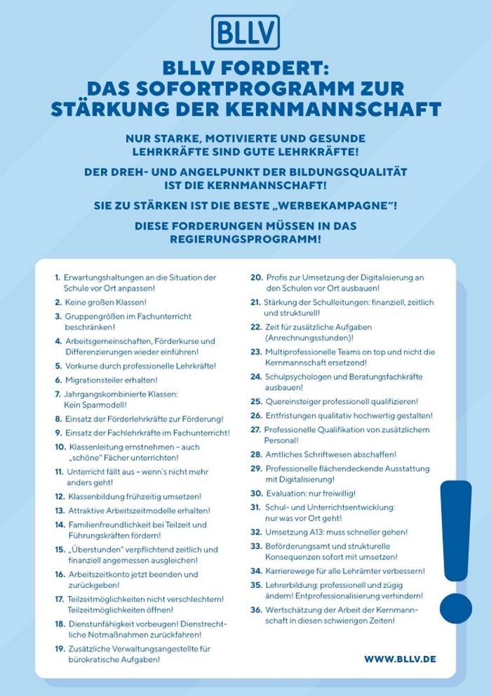 -> Wortlaut: "Der Bayerische Lehrer- und Lehrerinnenverband (BLLV) begrüßt das Maßnahmenpaket grundsätzlich, gibt aber zu bedenken, dass man sich immer noch mitten im Lehrermangel befinde. Mehr Qualität, mehr Leseerziehung, mehr Zuhören, mehr Schreibkompetenz bei Kindern – „das ist die richtige Antwort und das wissen wir“, betonte BLLV-Präsidentin Simone Fleischmann. Aber die Lehrkräfte vor Ort müssten auch die Chance haben, das umzusetzen. Unter anderem brauche es beste Arbeitsbedingungen für Lehrkräfte, um den Beruf wieder attraktiver zu machen."