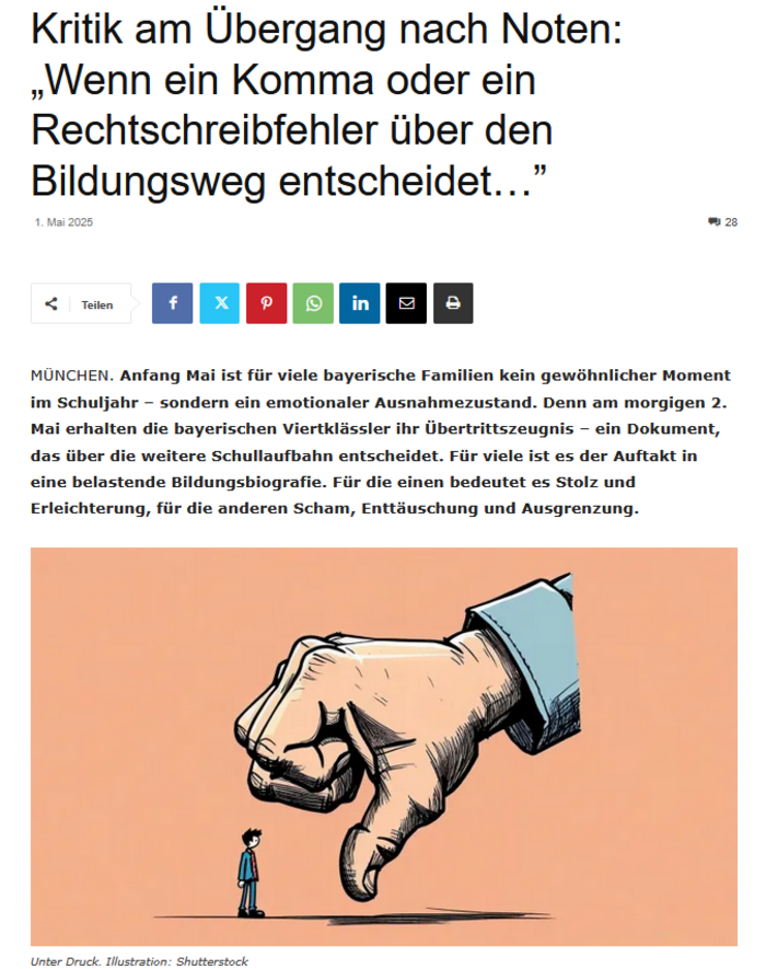 “Bayerns Viertklässler unter Druck” titelt der Nordbayerische Kurier (kostenpflichtiger Inhalt)und bemängelt das teilweise hohe Arbeitspensum für Grundschulkinder, insbesondere für Viertklässler:innen vor dem Übertritt. Wichtige Weichen für Studium und Ausbildung werden damit in Bayern oft schon in der Grundschule gestellt. Das wirke sich auch ganz praktisch auf den Unterricht und die Kinder aus: jede Menge Unterrichtsstoff, Hausaufgaben und Prüfungen in irgendeiner Form. Ein Arbeitspensum, das viele Kinder überfordert und sicher nicht für Freude am Lernen und an der eigenen Leistung sorgt. Die Konsequenz: “Eltern und Lehrer fordern Änderungen beim Schulübertritt”, wie die Frankenpost - ebenfalls am 25. April - titelt (nur in der Printausgabe verfügbar). Das auf Noten und Leistung fokussierte System beim Übertritt auf weiterführende Schulen im Freistaat sei eines der strengsten in der Bundesrepublik und wie der BLLV immer wieder betont: eines das den Kindern nicht gerecht wird und Bildungsungerechtigkeit forciert. Fast alle anderen Bundesländer setzen schon seit langem auf eine längere gemeinsame Schulzeit und beziehen den Elternwillen in hohem Maße in den Übertritt ein.
