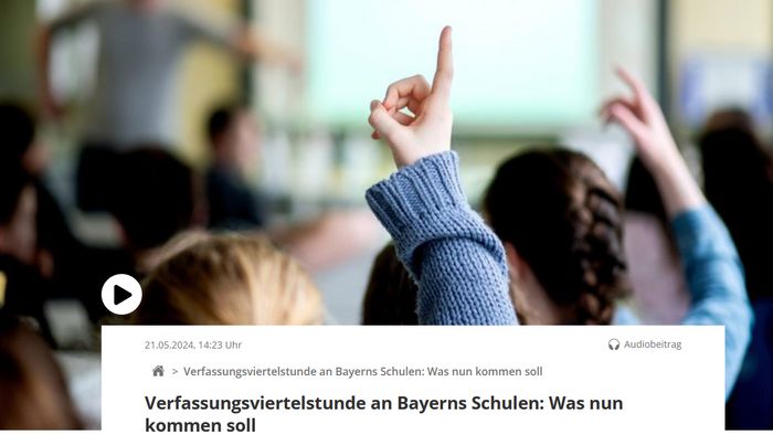Jetzt hat das Thema erneut an Aktualität gewonnen. Wie unter anderem der BR auf Basis einer aktuellen dpa-Medlung berichtet, soll die Verfassungsviertelstunde demnächst konkret umgesetzt werden - allerdings nur in ausgewählten Jahrgangsstufen. Nach den aktuellen Meldungen befinde sich das Konzept zwar noch in der Abstimmung, das Verfahren soll aber vor dem Abschluss stehen. Das Kultusministerium hat sich laut BR-Bericht aber noch nicht zu den Plänen geäußert. Auch tagesschau.de berichtete - neben zahlreichen weiteren Medien.