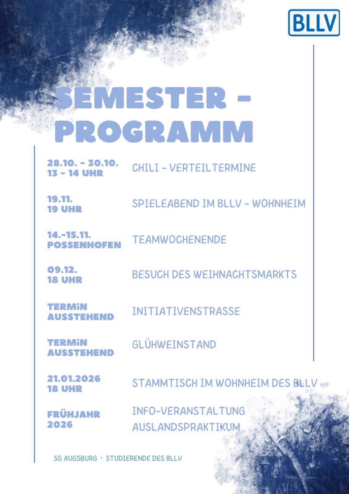 Hier findet ihr unser aktuelles Semesterprogramm für das Wintersemester 2025/26. Für genauere Informationen schait gerne bei uns auf instagram vorbei: @bllv.studierende.augsburg