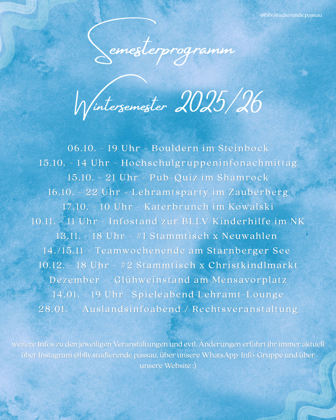 Wir haben uns ein abwechslungsreiches Programm überlegt, sodass für jeden etwas dabei ist! Schau gerne bei der ein oder anderen Veranstaltung ganz unverbindlich vorbei - wir freuen uns !